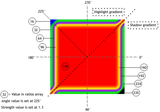 如果希望平均分布每个边缘的颜色,则使用奇数种颜色,其中中间的颜色为基本填充。平均分布颜色中 0 到 127 以及 129 到 255 之间的值,然后调整值以更改渐变中颜色的每个条纹的宽度。对于具有九种颜色的渐变斜角,可能的数组为 [16, 32, 64, 96, 128, 160, 192, 224, 235]。下面的图像对渐变斜角进行了描绘,如下所示: